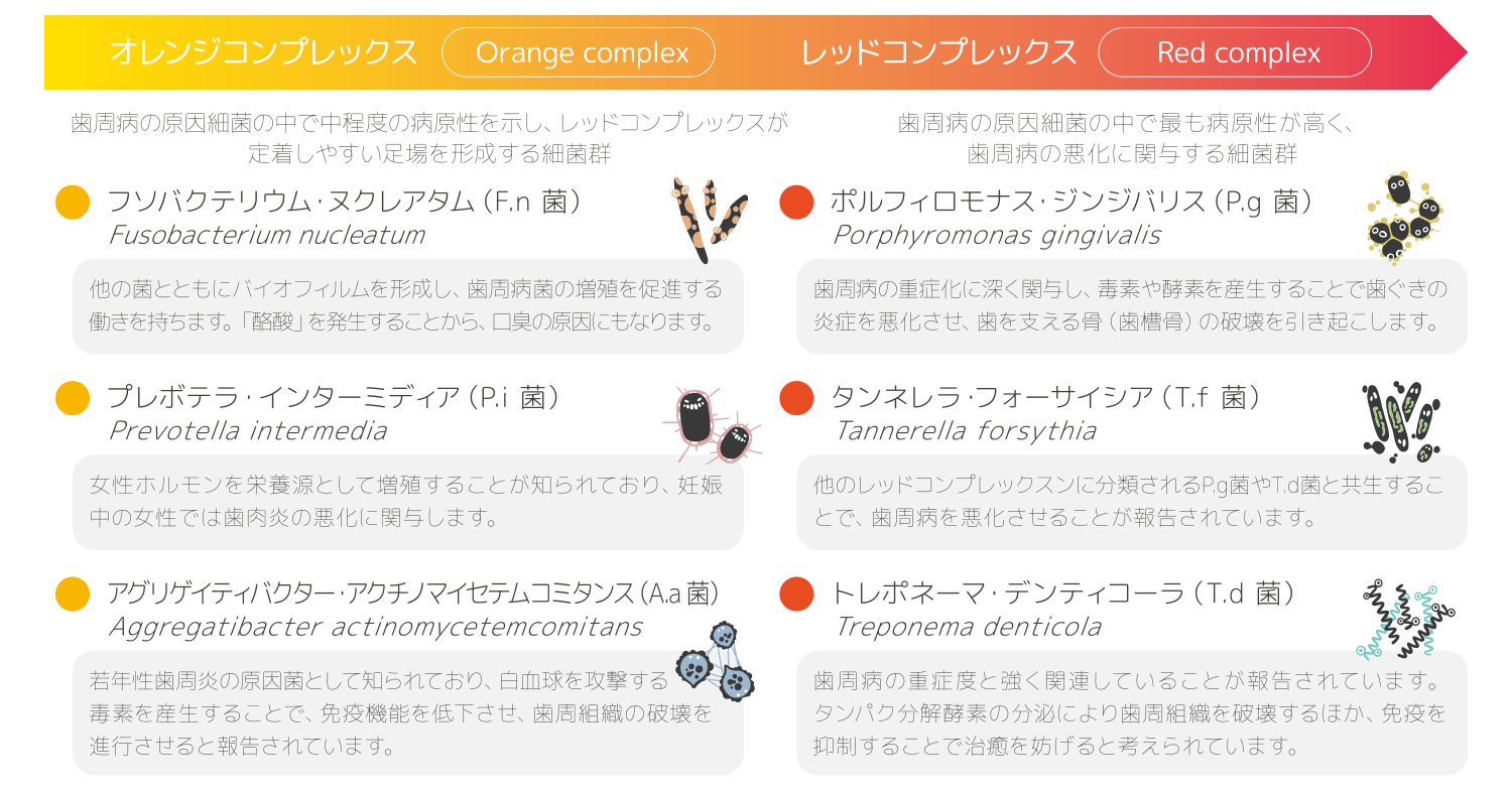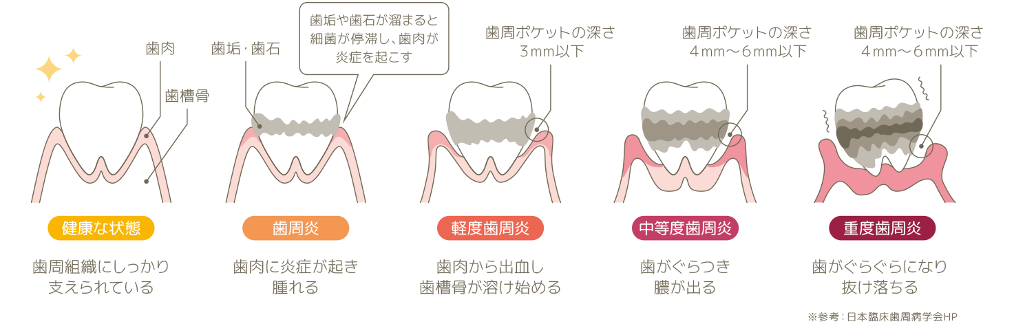 お口の中に細菌が感染して起こる炎症性の病気です。歯垢や歯石が溜まると、そこにたくさんの細菌が住み着き、歯肉の炎症を引き起こし歯周炎となります。歯周炎が進行すると腫れや膿がでたり、次第に歯がぐらつき、最後には歯が抜け落ちてしまいます。