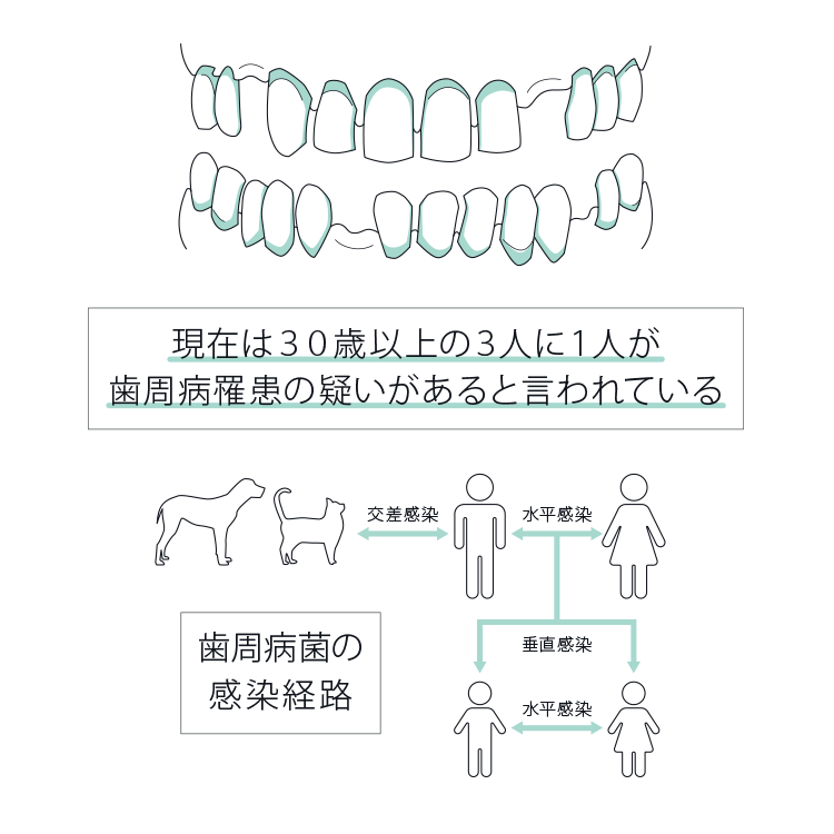 歯周病菌は親から子へ、パートナーへと感染し、さらにペットとも感染し合うことも報告されています。
